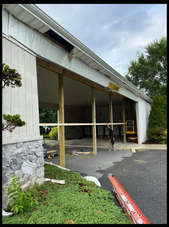 Our crew began by conducting a safe structural assessment, isolating and removing all compromised framing, sheathing, and exterior metal panels. We then installed new LVL (laminated veneer lumber) support beams, rebuilt the intermediate framing, and applied fresh exterior metal siding to match the original façade. The rebuild work was completed on August 15, 2025, restoring full structural integrity and aesthetic continuity for the mail center.